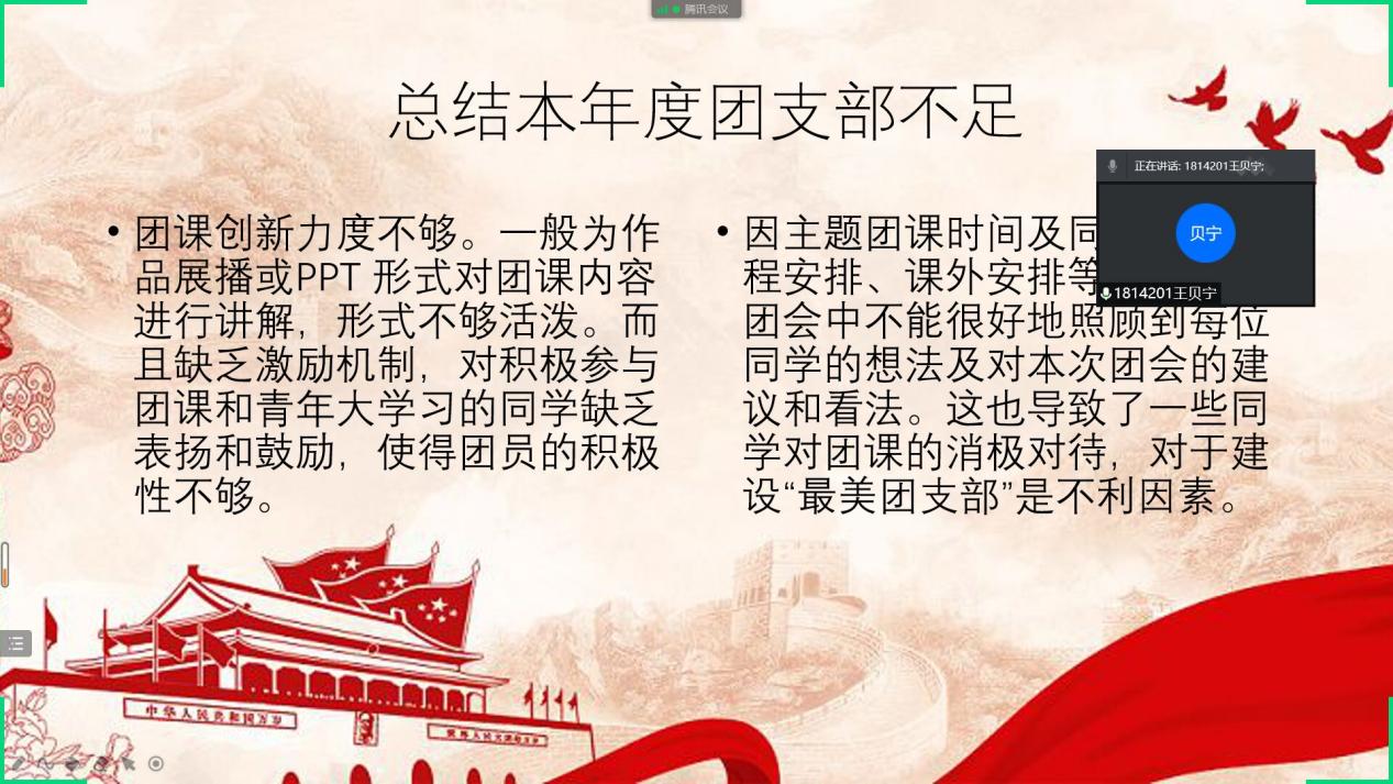本次评议大会,各年级团支书主要从班级团支部简介、团支部工作、工作展望、工作总结这四个方面,全面、客观、深入地进行述职汇报,总结工作中的得失,并对团支部工作、团课学习、班级团建等工作进行了规划和展望。通过这样的工作交流形式,明确共青团工作的努力方向,使各团支部对全院团的工作思路、工作重点、工作方法和工作载体更加明晰,增强了团干部的责任意识和工作能力,为更好开展团的工作奠定了基础,也展现出各团支部丰富多彩的课余生活和积极向上、团结和谐的支部精神。