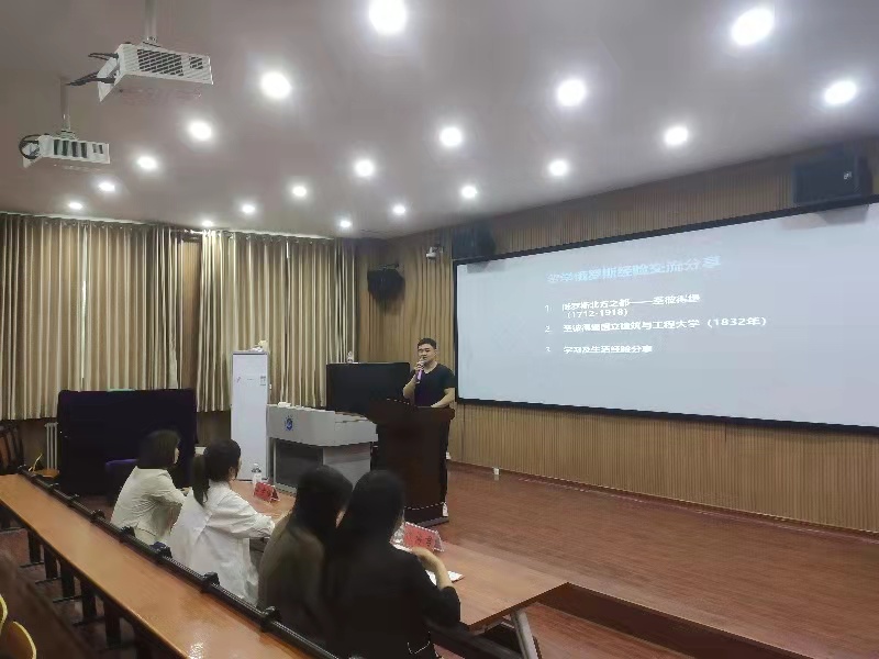 刘建丰博士根据自身经历,分别从学习体验、外出交流和未来选择三个方面进行分享。他图文并茂的向同学们介绍了圣彼得堡国立建筑与工程大学的特色教学模式和学风,同时也分享了自己初赴俄罗斯进行交流学习时适应全俄语教学环境的经验。其中,他特别谈到了尝试不同环境和进行学习实践对于开阔眼界、充实自我和锻炼能力的帮助。刘建丰鼓励同学们在本科阶段不宜给自己过多限制,而应该树立多元发展的理念,努力开拓视野,在不断尝试中找到最适合自己的发展方向。他号召同学们要将个人发展的“小我”融入我国社会主义建设的“大我”之中,以实际行动践行使命担当。