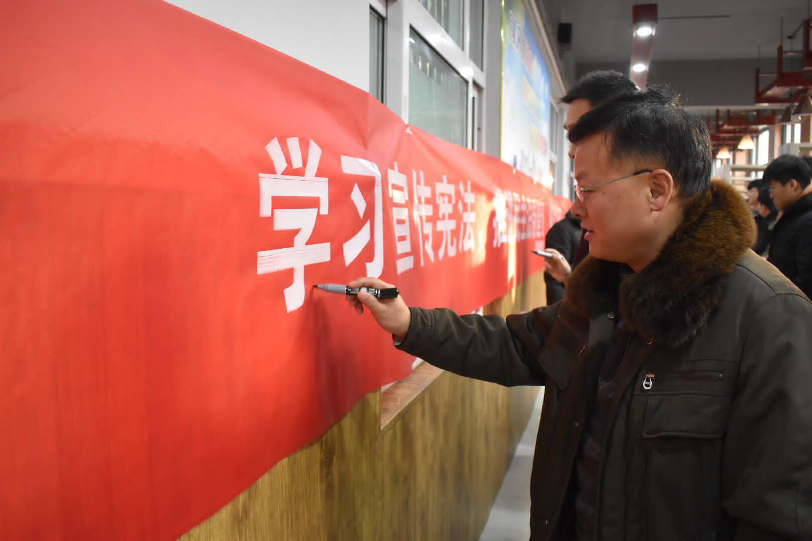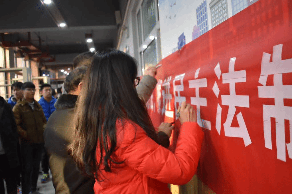 在本次活动中,同学们热情高涨,都积极参与了进来,宪法日确立在每年的12月4日,而之所以确定这一天为“宪法日”,是因为中国现行的宪法,在1982年12月4日正式实施。宪法是国家的根本大法,是不可或缺的,将宪法实施日定为“宪法日”,意义十分重大。本次活动进行的十分顺利,老师和同学们也都在横幅上庄重的签下了自己的姓名。