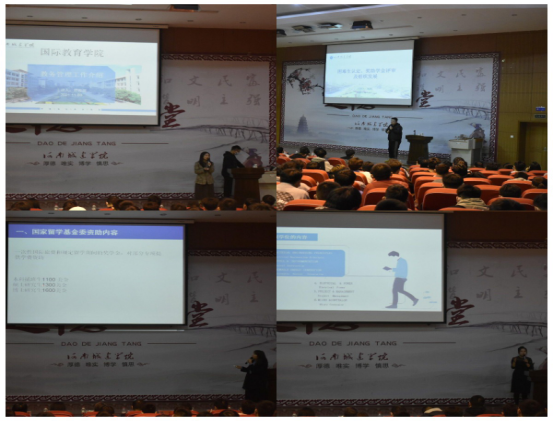 随后公司教务办贾俊丽老师对教务管理工作,学工办副主任张锐对奖助学金及组织发展,语言中心副主任张晓玉对国家留学基金委公派留学,团总支副书记闫艺超对英方双学位进行了详细的介绍和说明。