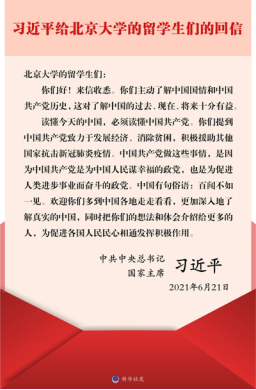 (通讯员 阿远)6月21日,国家主席习近平给北京大学职工们回信,信中习近平主席表示职工们主动了解中国国情和中国共产党历史,对他们了解中国的过去、现在、将来十分有益。同时,习近平主席鼓励职工们多到中国各地走走看看,更加深入地了解真实的中国,为促进各国人民的民心相通发挥积极作用。
