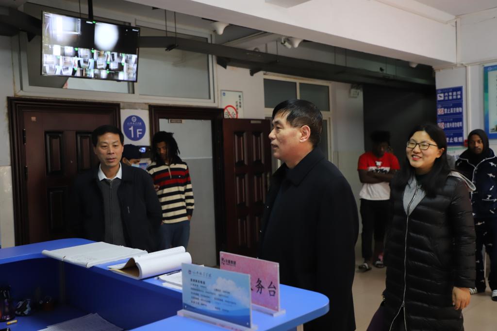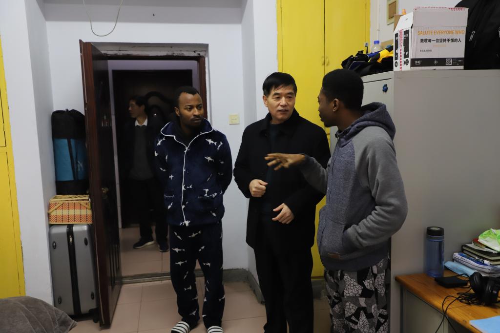 宿金勇查看了职工宿舍,与职工进行了面对面交流,仔细询问了疫情以来员工的学习和生活情况以及他们各自国家的疫情状况,叮嘱他们要适应常态化的疫情防控,做好科学防护措施,常开窗,勤通风,非必要不外出、不聚集;要注意饮食营养,合理安排作息,注意用电安全,加强体育锻炼,做好时间规划,加强汉语学习,学习中国文化,认真完成课业任务;要多与家人沟通,客观地介绍中国的疫情情况,多讲中国抗疫故事,让家人安心放心。他要求:国际交流与合作处、后勤处要加强沟通,密切关注同学们的在校生活,做好假期学习和后勤保障。