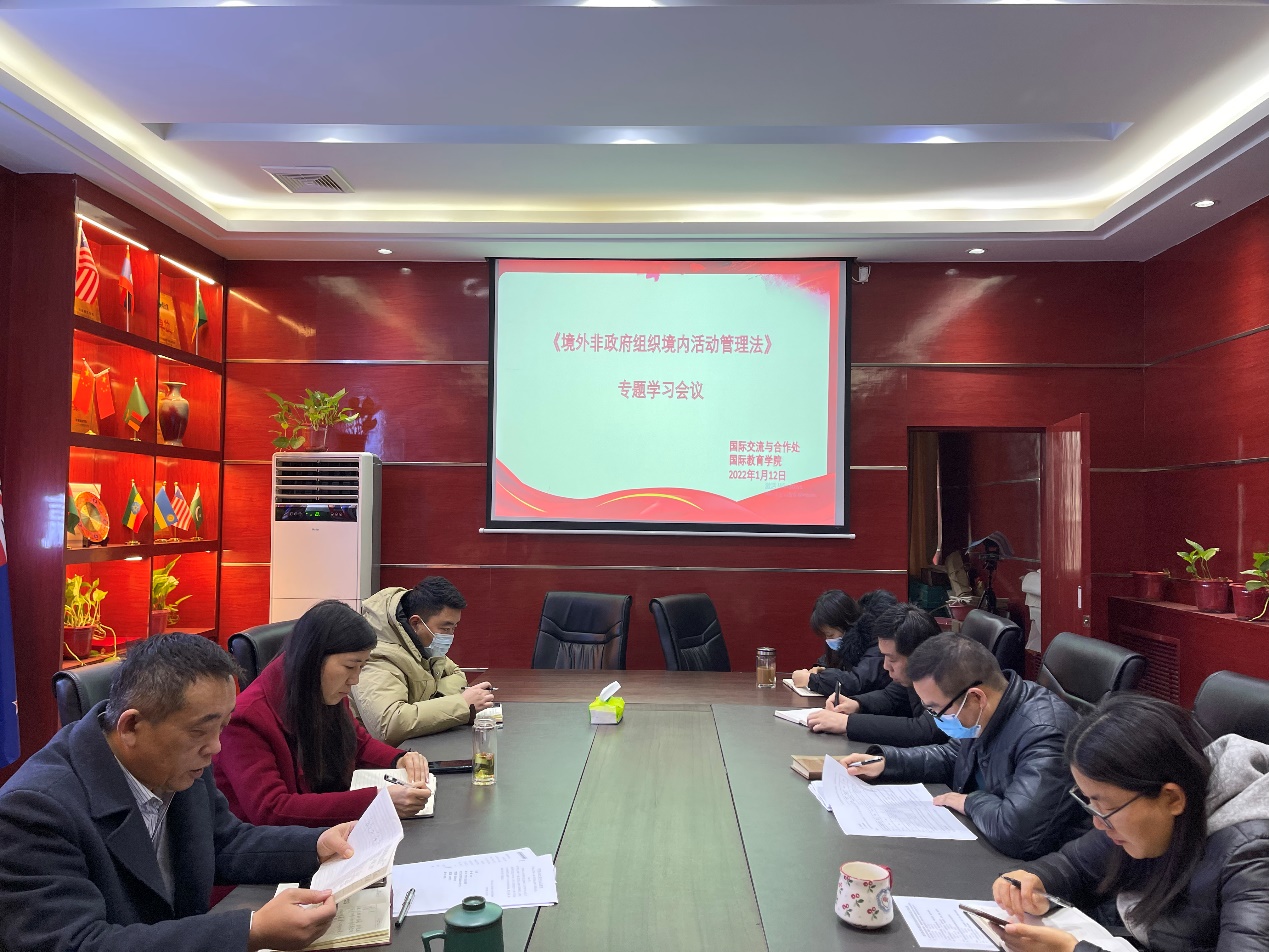 (通讯员 王迪)在《中华人民共和国境外非政府组织境内活动管理法》(以下简称《管理法》)实施五周年之际,为进一步加强普法宣传,增强师生法律意识,强化师生安全防范能力,1月12日上午,申博sunbet在和谐校区211会议室召开《中华人民共和国境外非政府组织境内活动管理法》专题学习会议。会议由国际教育公司党委书记吕鹏飞主持,全体教职工参加了本次会议。